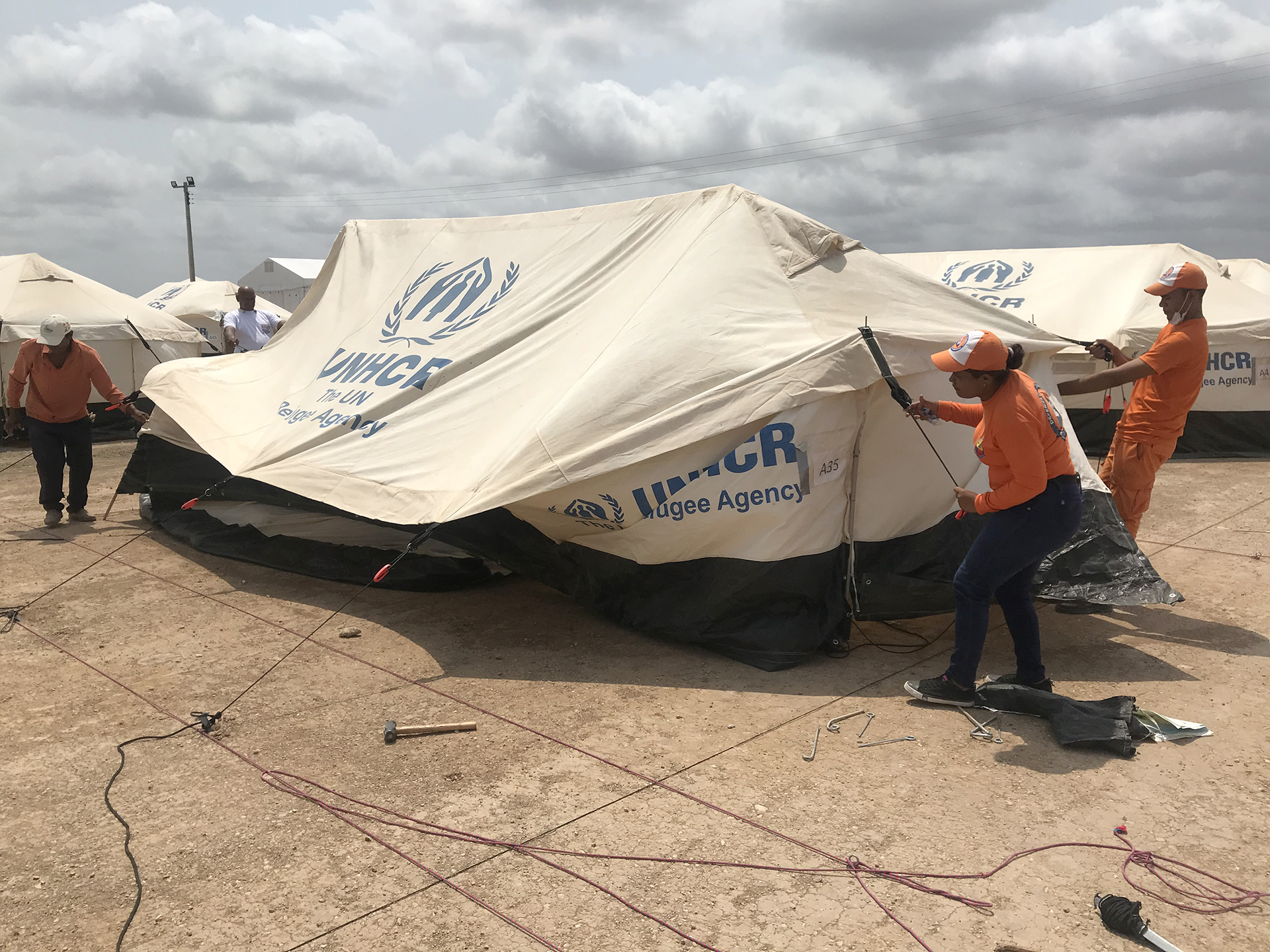 Volunteers move a tent at the new UN camp for Venezuelan migrants in Maicao, Colombia on 20 March 2019.
